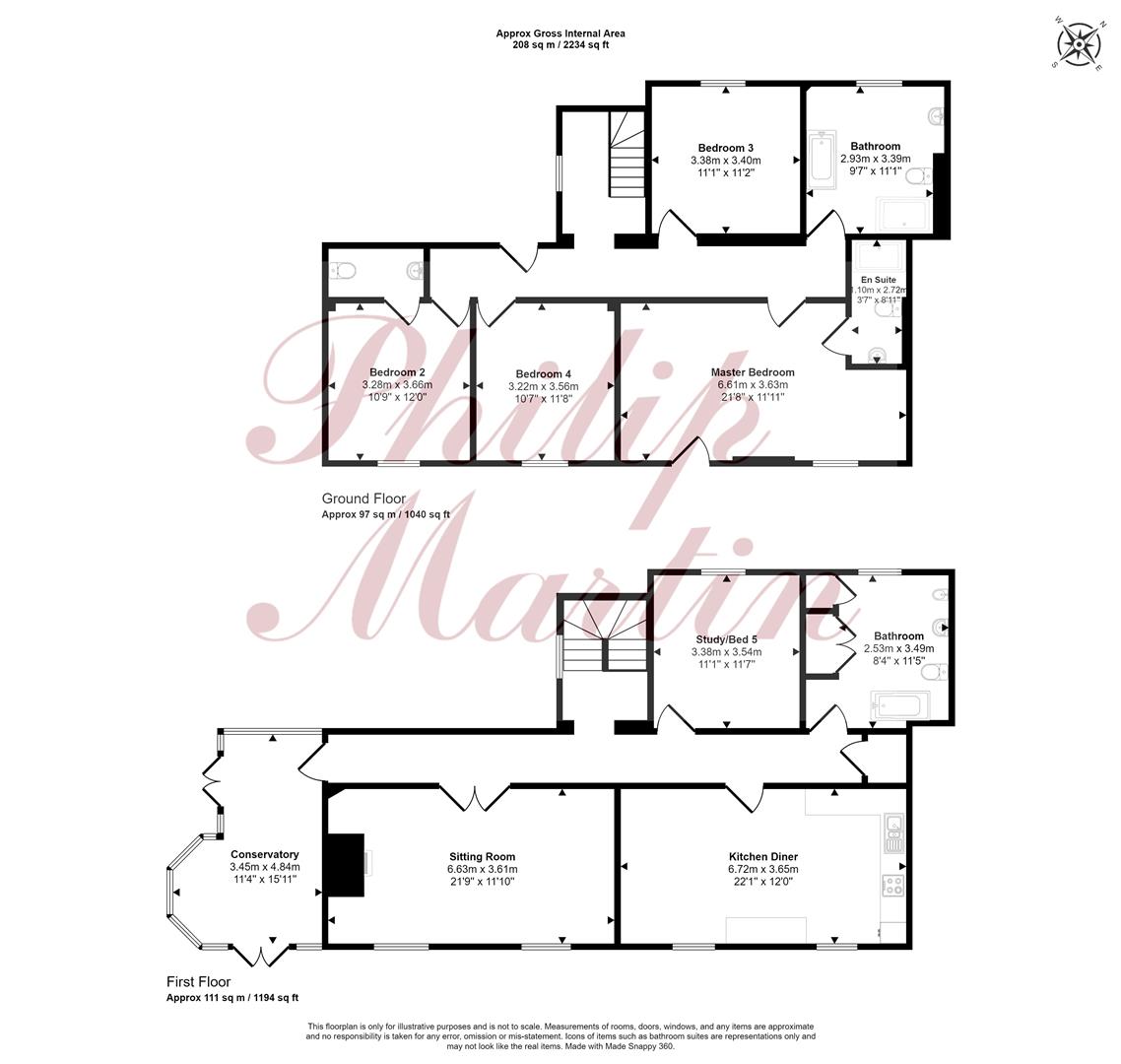 A staircase leads down to the lower ground floor, which includes a light and spacious master bedroom with an en-suite shower room, a guest bedroom with an en-suite WC, two additional double bedrooms, and another large bathroom.