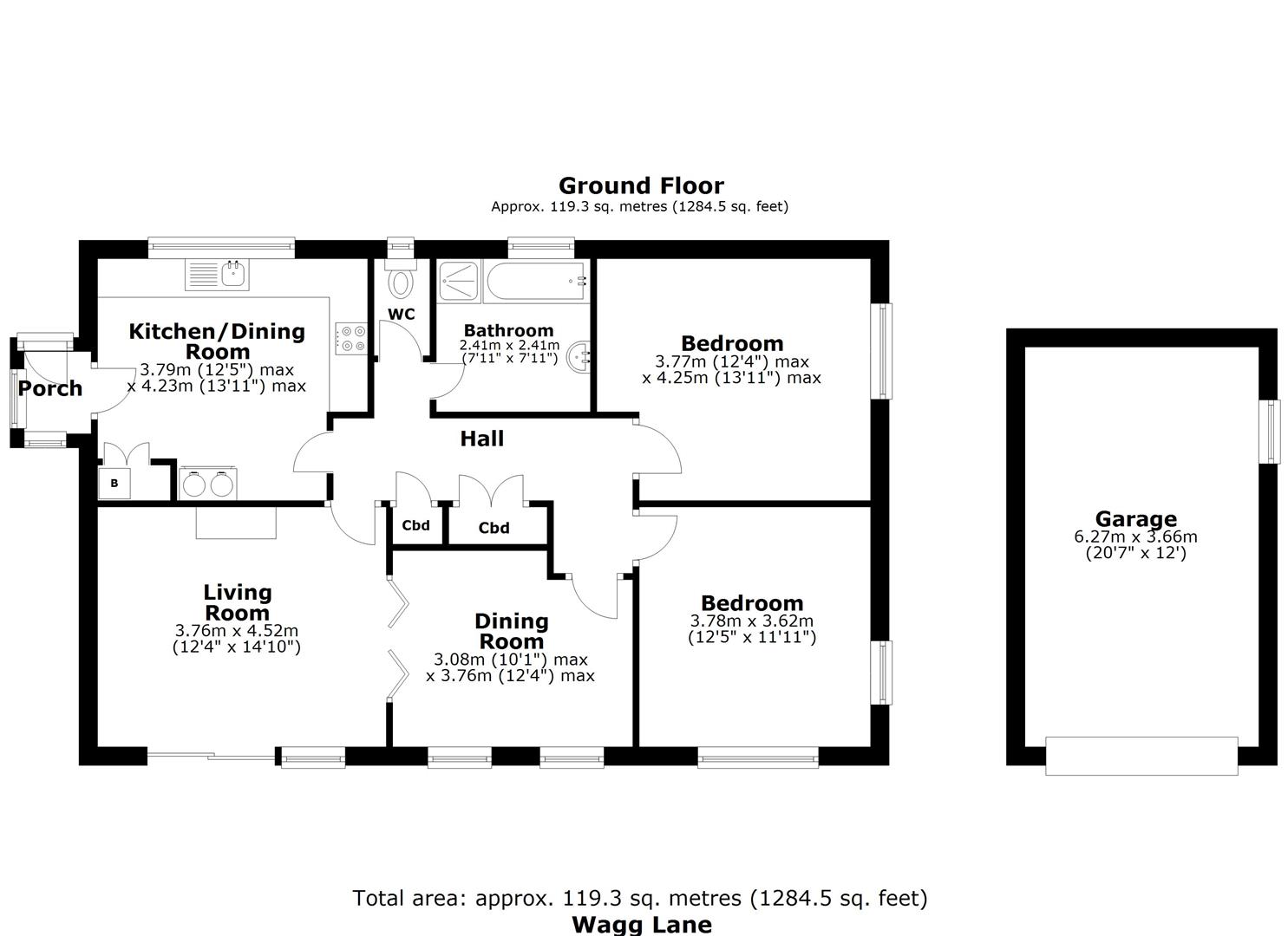 Manderville is approached from Wagg Lane via double gates and a tarmac drive leads up to the property where there is turning and ample parking for three cars. Steps lead up the side of the bungalow to the entrance porch. The front garden includes two lawns that slope gently down to Wagg Lane divided by the driveway. The garden is enclosed within a solid wooden fence with dense borders on the northern side including mature camellias and hydrangeas. There is useful storage under the bungalow through double doors. Access to: