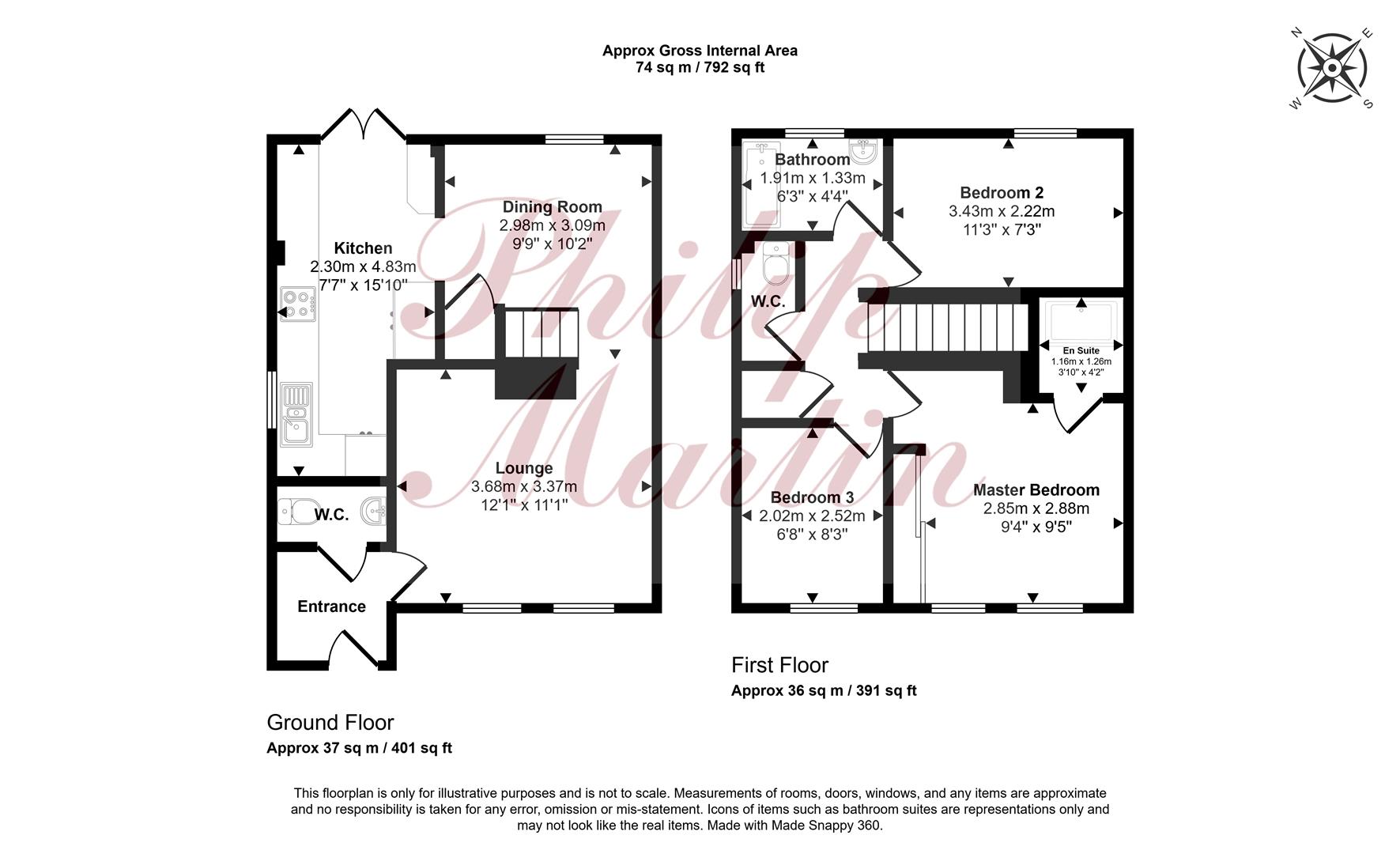 On the first floor, the principal bedroom benefits from fitted wardrobes and an en-suite shower room. The second bedroom is a good-sized double and the third single, suitable as a child’s room or home office. The family bathroom is fitted with a bath and overhead shower, with a separate W.C. located adjacent.