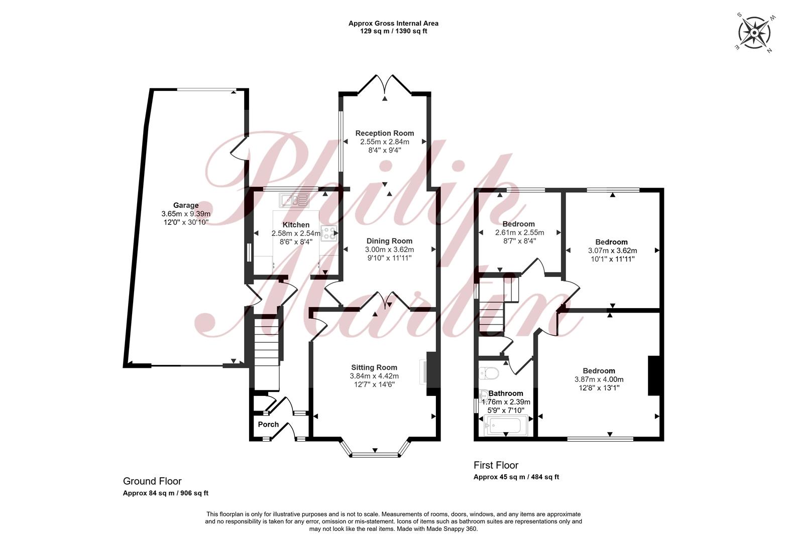 Comprising bath with shower over, pedestal hand wash basin and low level w.c. Obscured window to side, heated towel rail and extractor fan.